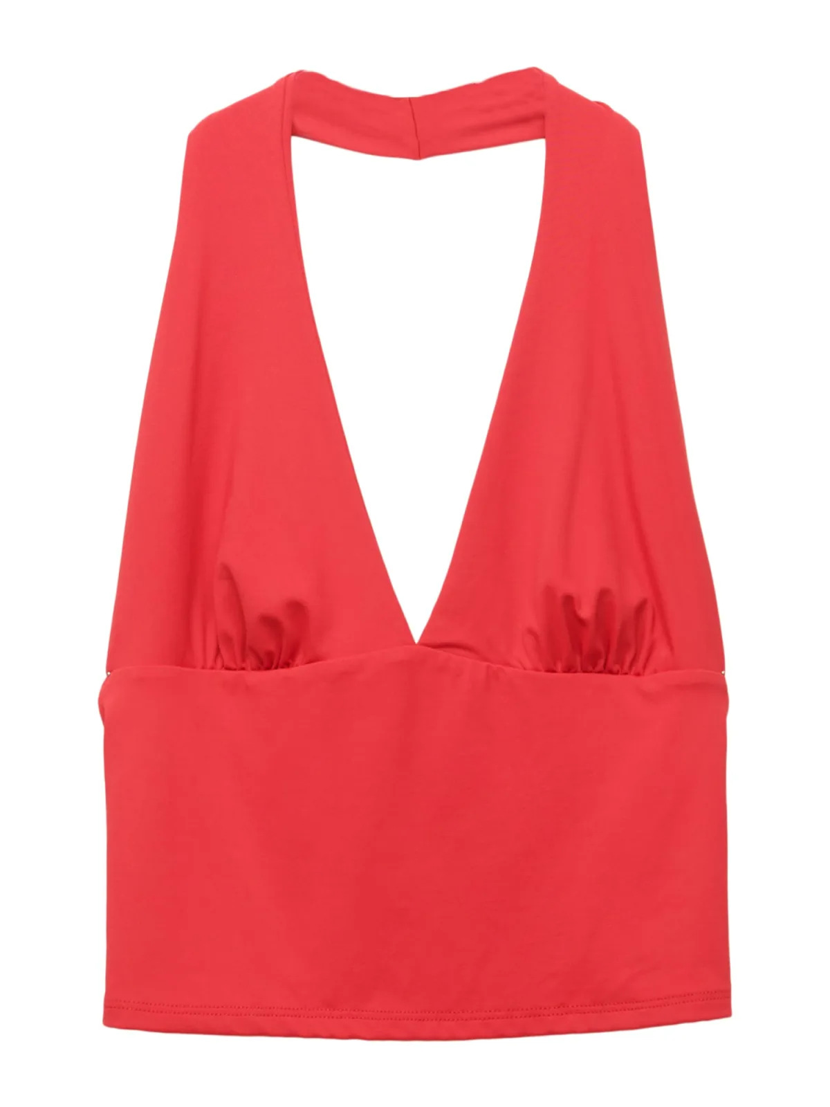 Design: Gevoerde zoom/rand, Rechte zoom, Diepe snit/decolleté; Materiaal: Jersey; Halstype: V-hals; Motief: Effen; Soort bandjes: Haltermodel; Details: Gedrapeerd; Extra's: Op staal naden, Voelt zacht aan; Pasvorm: Aansluitende pasvorm; Armlengte: Mouwloos; Lengte: Korte pasvorm