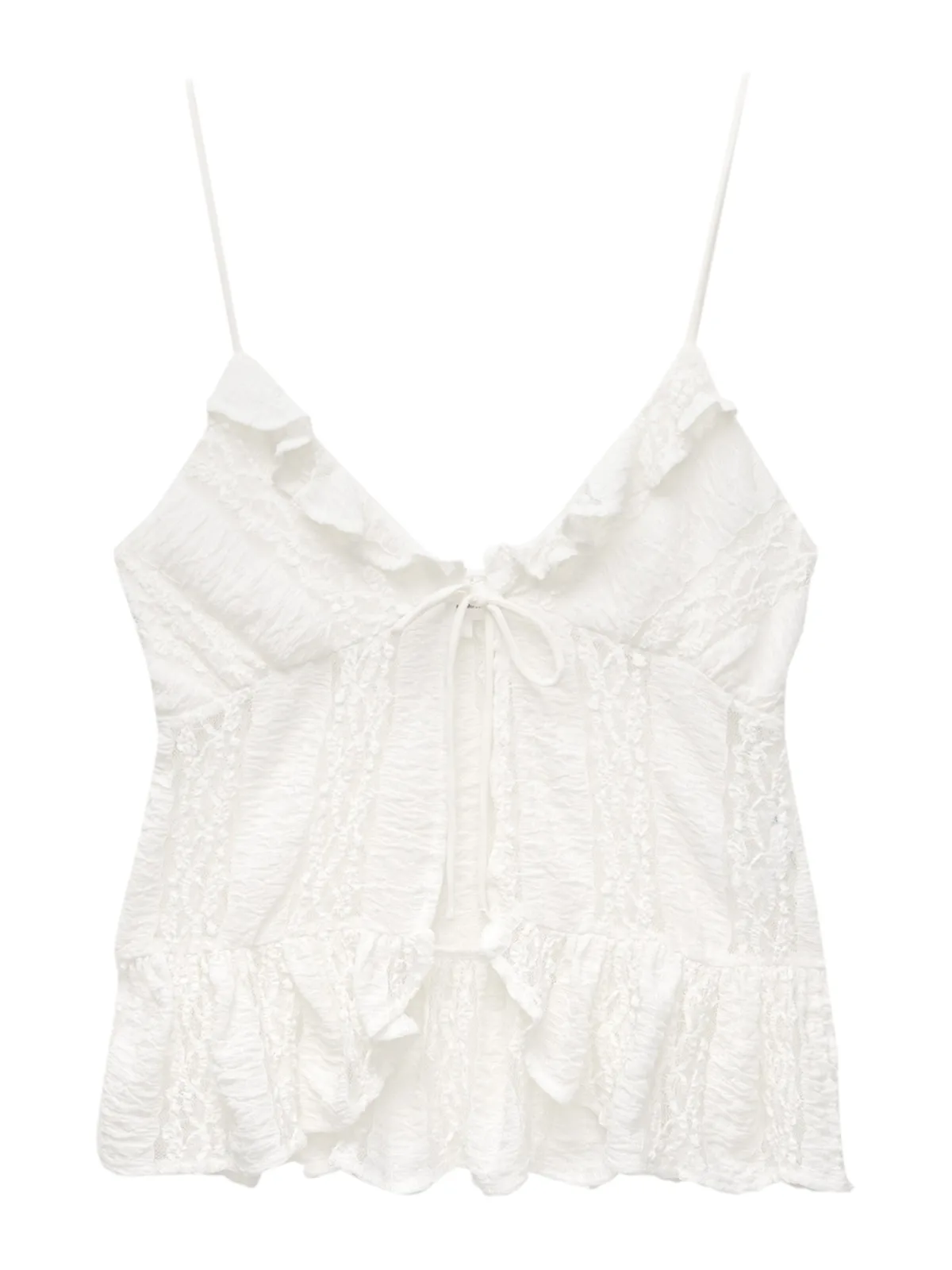 Design: Gevoerde zoom/rand, Diepe snit/decolleté, Om te knopen/binden; Halstype: V-hals; Motief: Effen; Soort bandjes: Spaghettibandjes; Details: Kant, Volant, Gedrapeerd; Extra's: Licht transparant, Op staal naden, Lichte stof; Pasvorm: Slanke pasvorm; Armlengte: Mouwloos; Lengte: Normale lengte