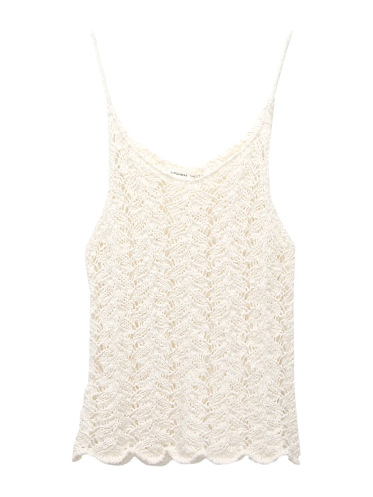 Design: Diepe snit/decolleté, Geschulpte zoom; Materiaal: Gehaakt; Halstype: V-hals; Motief: Effen; Soort bandjes: Spaghettibandjes; Details: Mesh; Extra's: Licht transparant, Met textuur; Pasvorm: Normale pasvorm; Armlengte: Mouwloos; Lengte: Normale lengte
