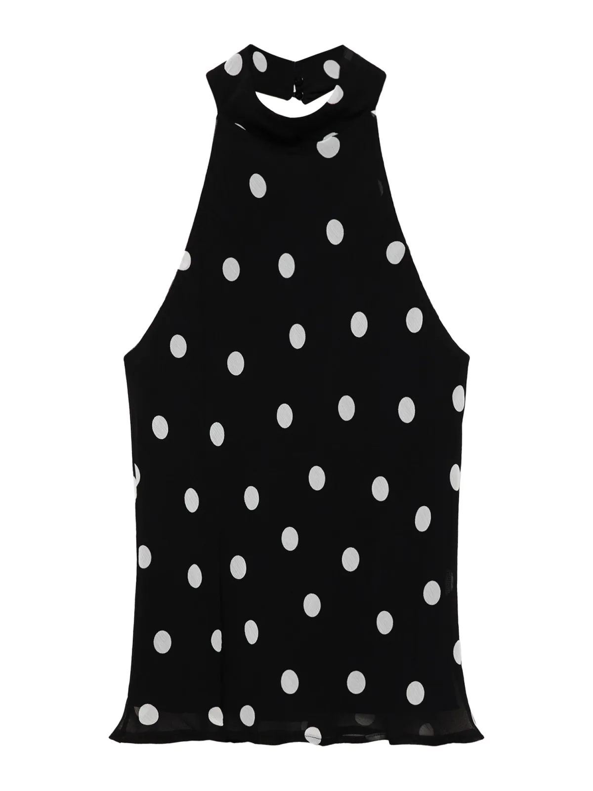 Design: Gevoerde zoom/rand, Strapless/off-shoulder, Knop sluiting; Materiaal: Viscose; Halstype: Opstaande kraag; Motief: Gestippeld; Soort bandjes: Haltermodel; Details: Backless; Extra's: All-over patroon, Gladde stof; Pasvorm: Normale pasvorm; Armlengte: Mouwloos; Lengte: Normale lengte