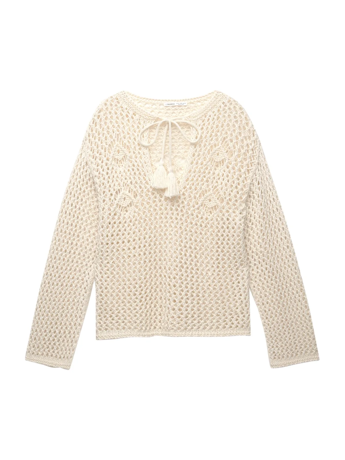 Design: Rechte zoom, Overcut schouder, Om te knopen/binden; Materiaal: Gehaakt; Halstype: Uitgesneden hals; Motief: Effen; Details: Mesh; Extra's: Visnet brei, Sterk transparant, Fully fashioned; Pasvorm: Losse pasvorm; Armlengte: Lange mouw; Lengte: Normale lengte