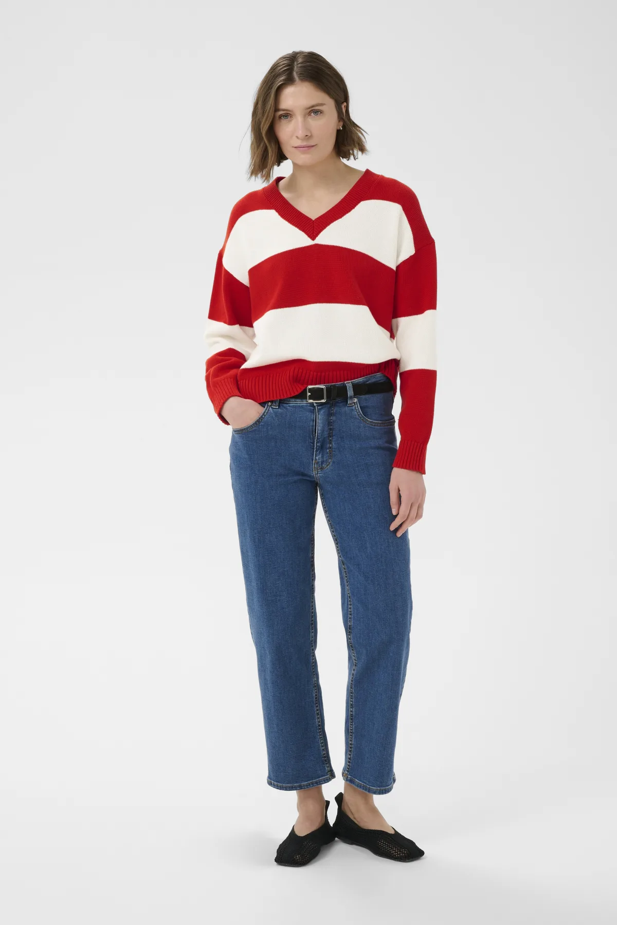 Gebreide trui met brede horizontale strepen, rechte relaxte pasvorm en V-hals. Afgewerkt met geribde boorden aan mouwen en zoom.