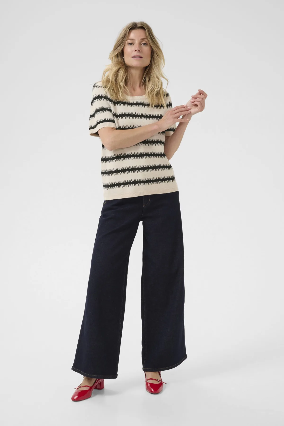 Design: Geribbelde kraag, Geribd ceintuurtje; Materiaal: Knitwear; Halstype: Ronde hals; Motief: Gestreept; Extra's: All-over patroon, Fully fashioned; Pasvorm: Normale pasvorm; Armlengte: Halve mouw; Lengte: Normale lengte
