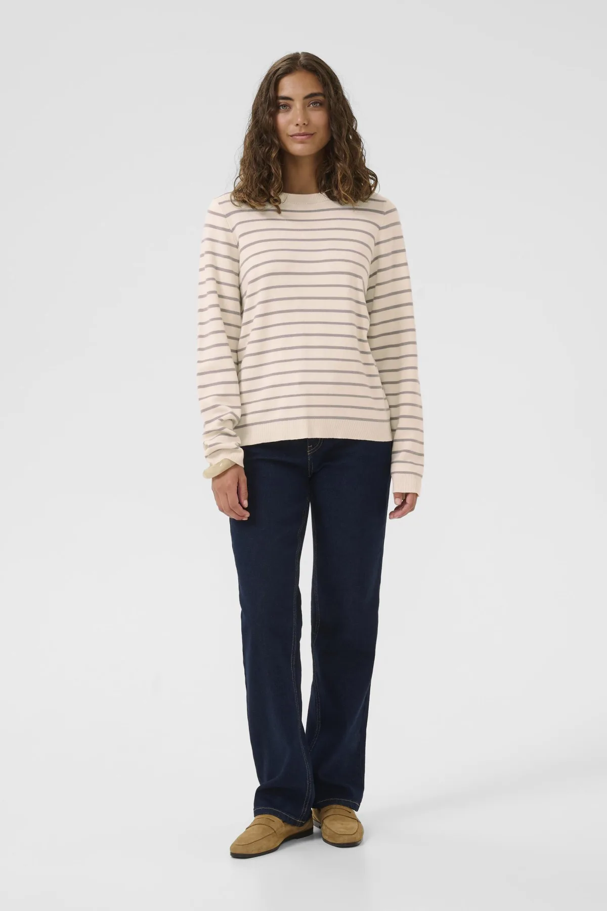 Deze damestrui met streepdessin heeft een losse pasvorm, ronde hals en lange mouwen. Ideaal voor dagelijks gebruik en gemakkelijk te combineren dankzij het tijdloze ontwerp. Fijne was 30°, niet bleken, niet in de droger drogen, Liggend laten drogen in de schaduw, koud strijken max. 110° C, 80% Viscose (LENZING™ ECOVERO™),20% Polyamide