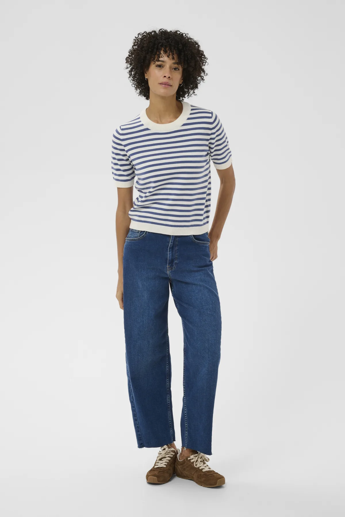 Gebreide top met korte mouwen, ronde hals en comfortabele, losse pasvorm. Geschikt voor diverse dagelijkse en informele gelegenheden.