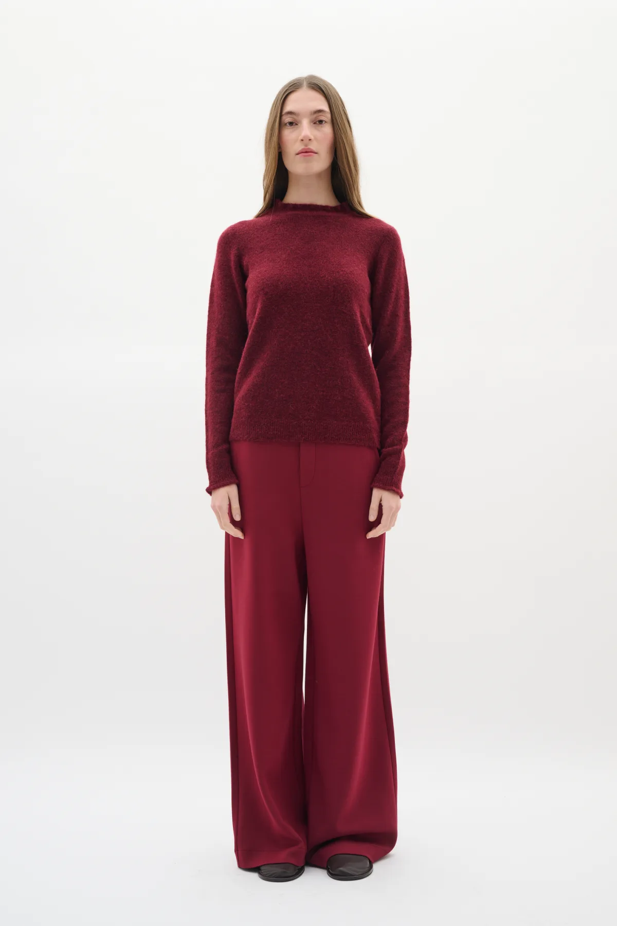 Dames gebreide trui met comfortabele pasvorm, lange mouwen en subtiel geplooide halslijn. Zachte stof, geschikt voor dagelijks gebruik en lagen. Handwas, niet bleken, niet in de droger drogen, Liggend laten drogen., koud strijken max. 110° C, 42% Polyester,26% Nylon,22% Wol,6% Alpaca,4% Elastaan
