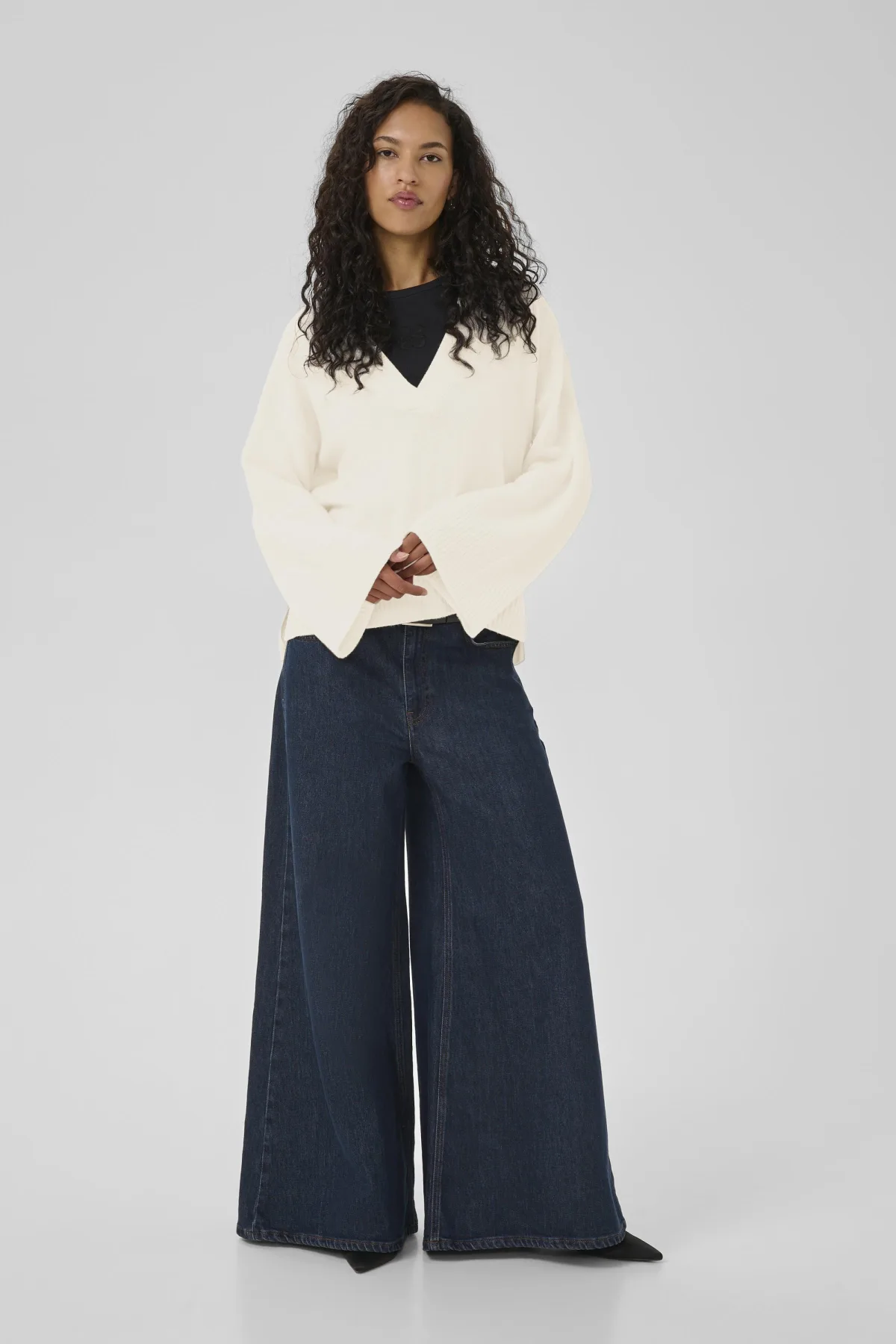 Deze trui met V-hals heeft een losse pasvorm en moderne uitstraling met wijde mouwen en geribde zoom. Comfortabel en veelzijdig voor elke dag. Handwas, niet bleken, niet in de droger drogen, Liggend laten drogen., koud strijken max. 110° C, 95% Wol,5% Kasjmier