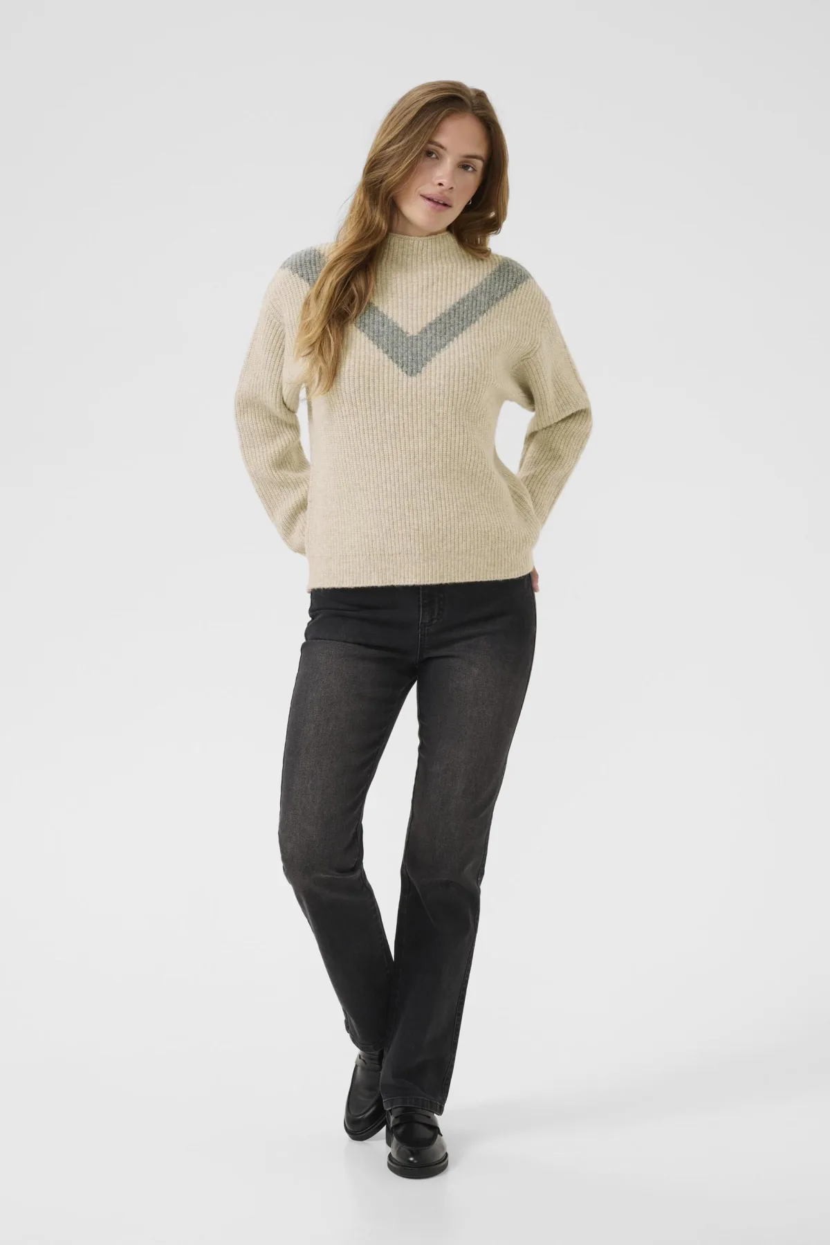 Deze damestrui heeft een comfortabele, losse pasvorm en hoge halslijn. De opvallende chevron op de borst en lange mouwen zorgen voor warmte en tijdloze stijl, geschikt voor dagelijks gebruik.