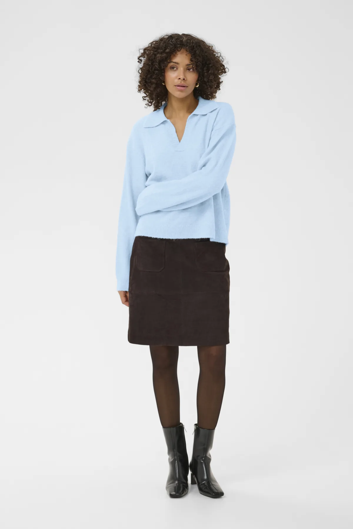 Trui met een rechte pasvorm, zachte uitstraling, open V-hals met kraag, lange mouwen en geribbelde boorden voor een moderne uitstraling.
