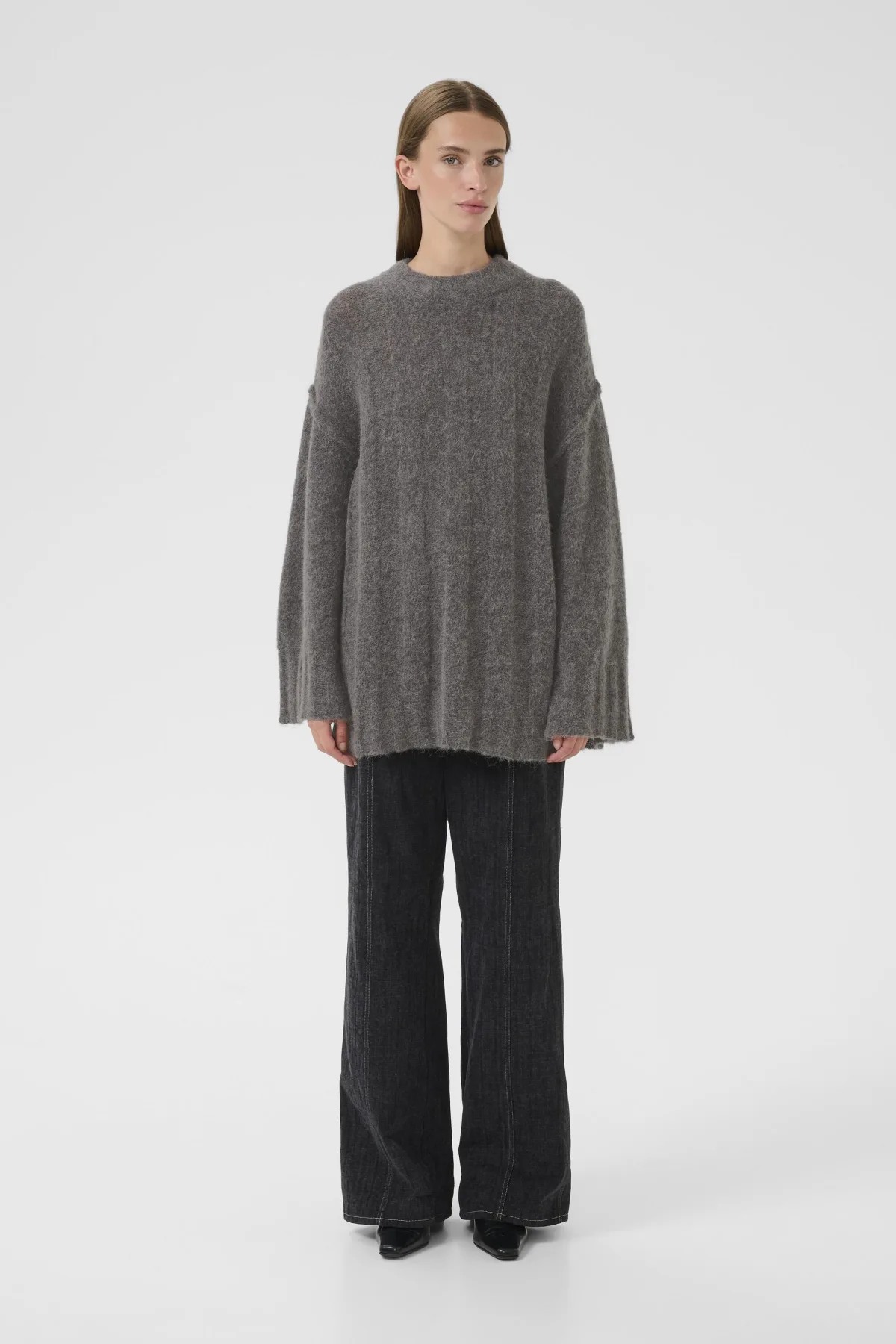 Deze damestrui met relaxed fit biedt lange mouwen en een comfortabele ronde hals. Het zachte breisel en de iets langere achterkant zorgen voor draagcomfort en veelzijdige stijl. Handwas, niet bleken, niet in de droger drogen, Liggend laten drogen., koud strijken max. 110° C,. 38% Alpaca,32% Polyamide,25% Wol,5% Elastaan