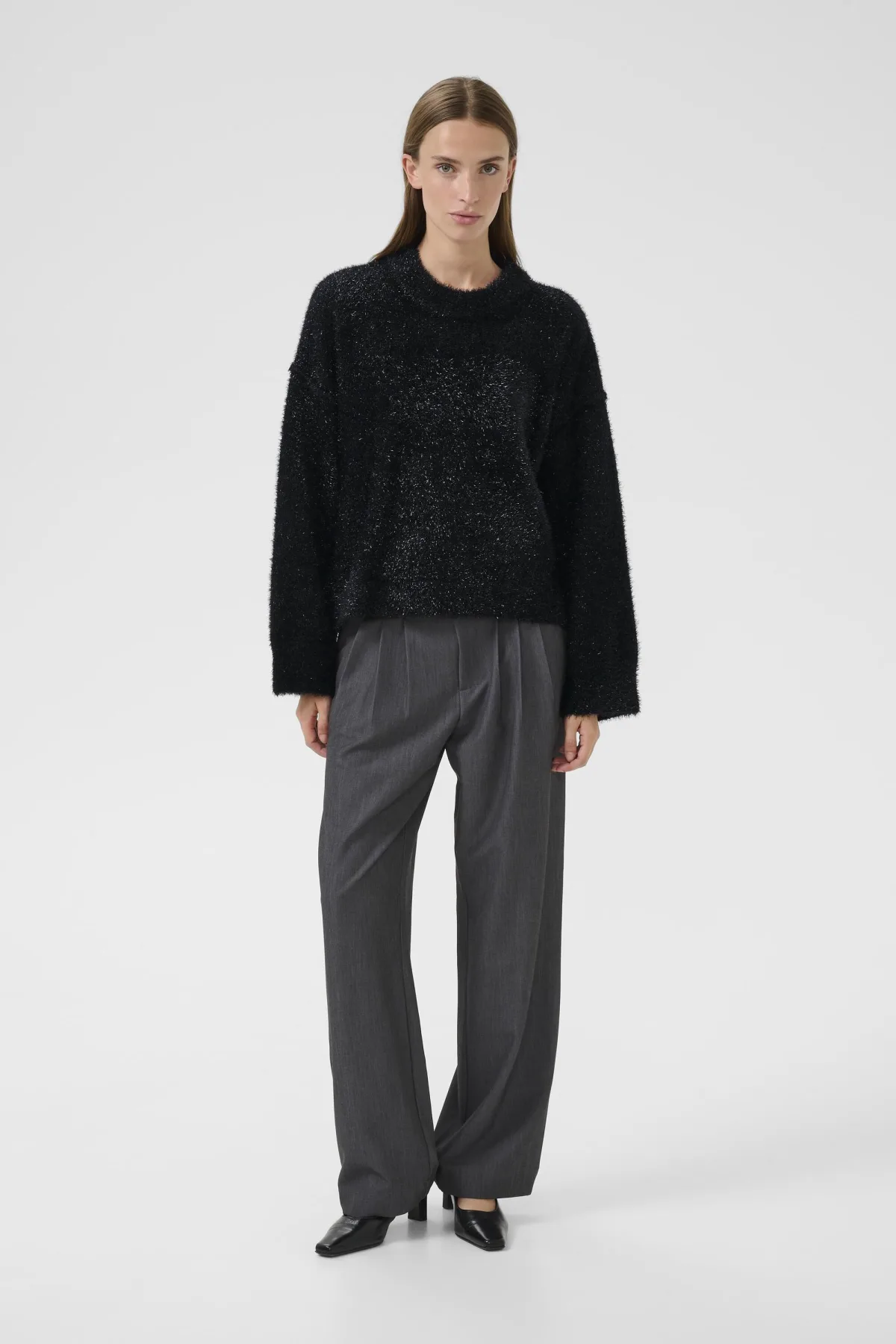 Glanzende gebreide trui met losse pasvorm, ronde hals en lange mouwen. Zachte textuur zorgt voor comfort en veelzijdige stijl.