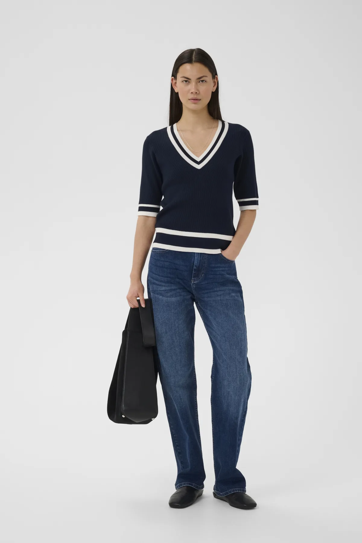 Geribd gebreide top met een rechte pasvorm, uitgesproken V-hals en ellebooglange mouwen. Zachte look met klassieke boord aan de onderzijde.