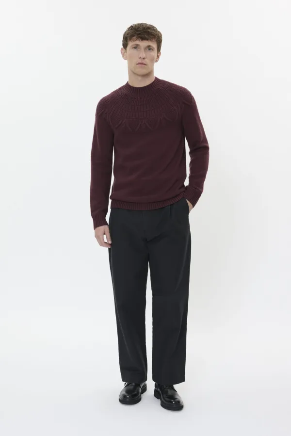 Heren gebreide trui met een comfortabele regular fit. Voorzien van ronde hals, lange mouwen en ribboorden. Gebreid detail op het borststuk voor extra stijl. Fijne was 30°, niet bleken, niet in de droger drogen, Liggend laten drogen in de schaduw, warm strijken max. 150° C, 64% Wol,36% Katoen