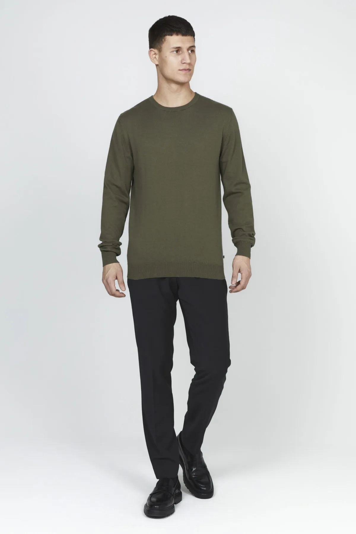 Fijngebreide trui met een ronde hals en slanke pasvorm. Afgewerkt met ribboorden aan mouwen en zoom voor een strakke, tijdloze uitstraling.
