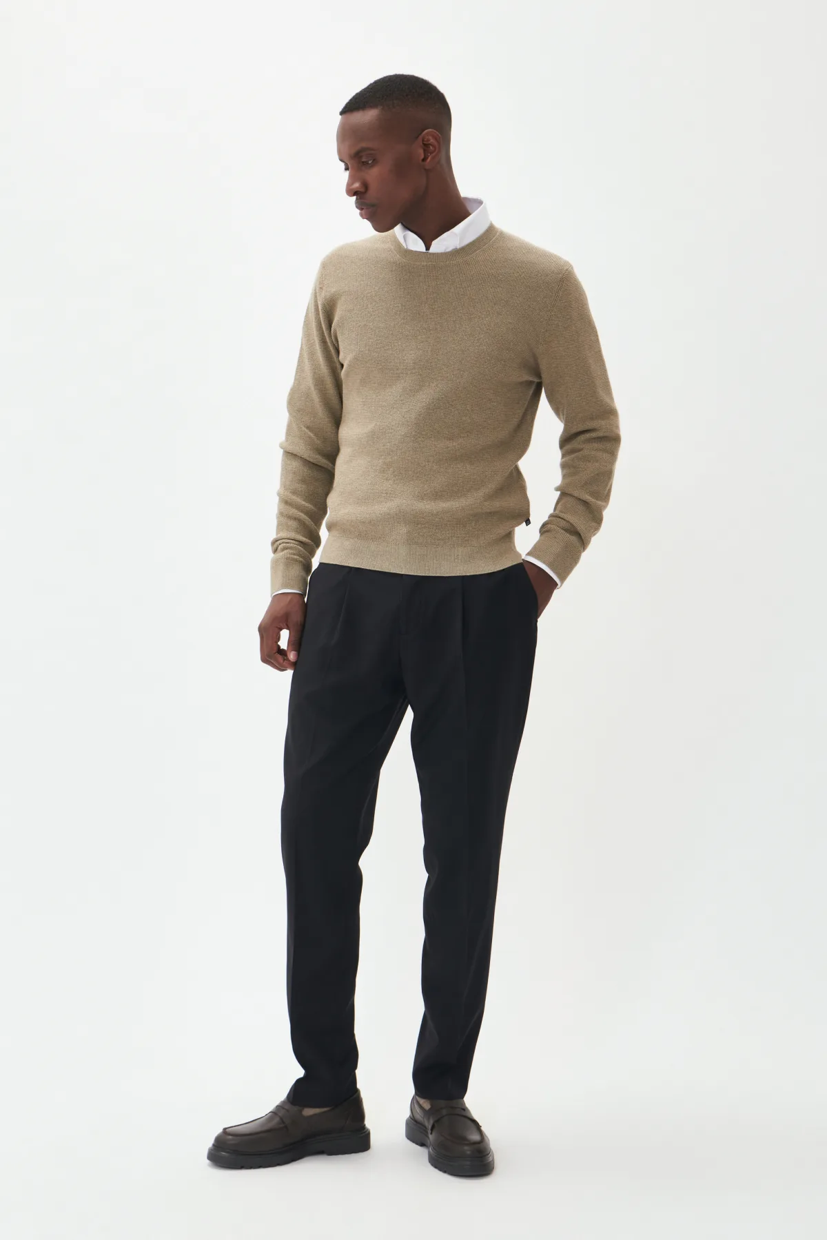 Heren trui met ronde hals, normale pasvorm en ribgebreide boorden. Zachte gebreide structuur biedt comfort en veelzijdigheid voor dagelijks gebruik. Fijne was 30°, niet bleken, niet in de droger drogen, Liggend laten drogen., koud strijken max. 110° C,. 80% Katoen,20% Polyamide