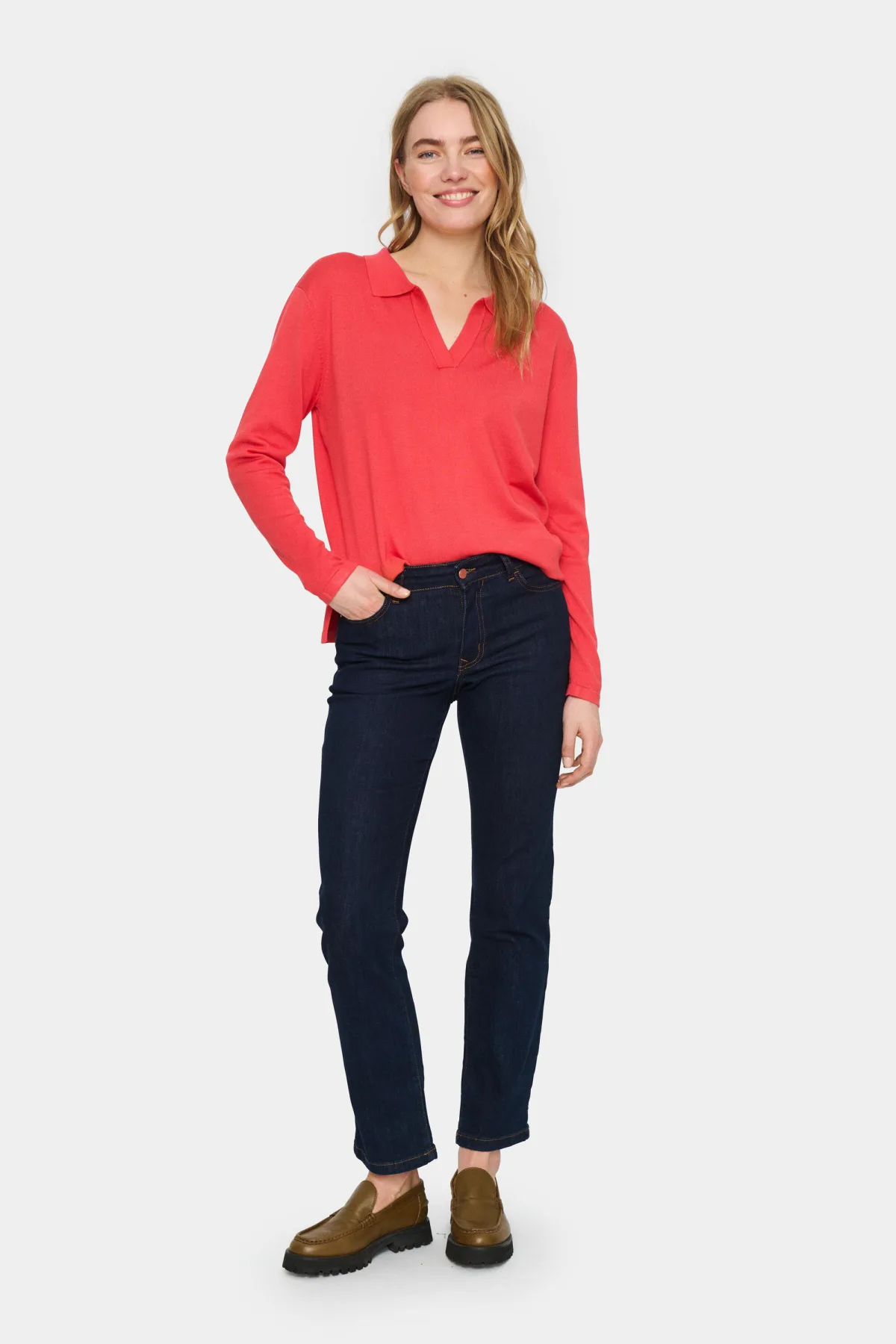 Dames top met lange mouwen, klassieke kraag en een ontspannen V-hals. De rechte, comfortabele pasvorm maakt dit shirt ideaal voor dagelijkse of nette gelegenheden en eenvoudig te combineren.