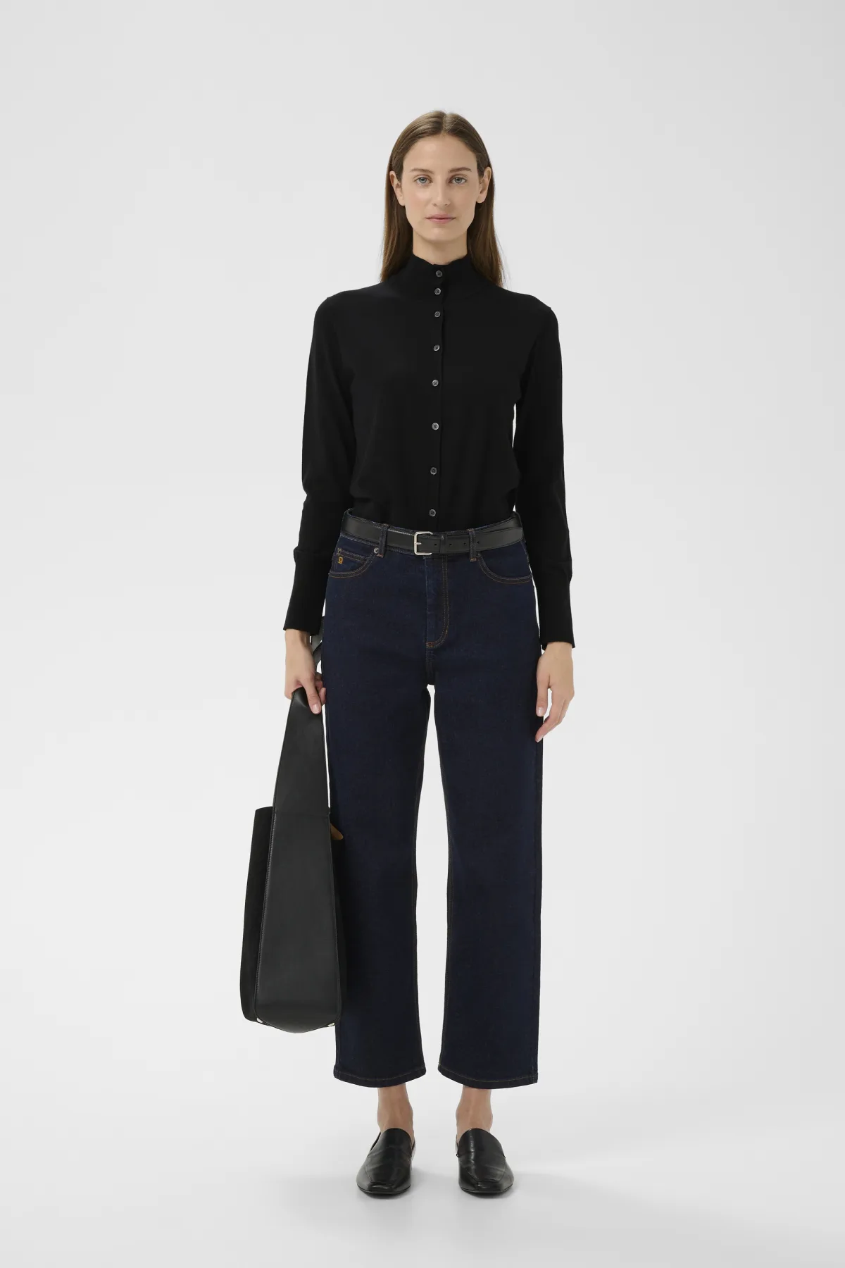 Dit vest heeft een aansluitende pasvorm, hoge geribde opstaande kraag en lange mouwen. Voorzijde met volledige knoopsluiting.