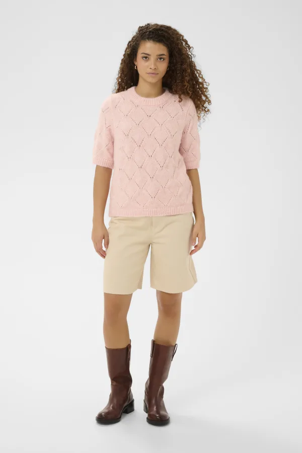 Deze trui met korte mouwen heeft een subtiel opengewerkt ruitmotief over het hele oppervlak. Het rechte model heeft een ribgebreide ronde hals en geribde boorden.