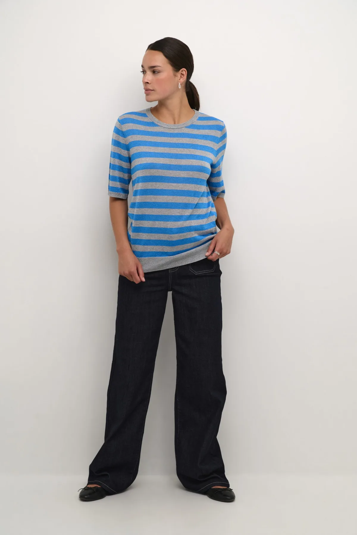 Design: Geribbelde kraag, Geribd ceintuurtje; Materiaal: Knitwear; Halstype: Ronde hals; Motief: Gestreept; Extra's: Glitterend, Metallic look; Pasvorm: Normale pasvorm; Armlengte: Halve mouw; Lengte: Normale lengte