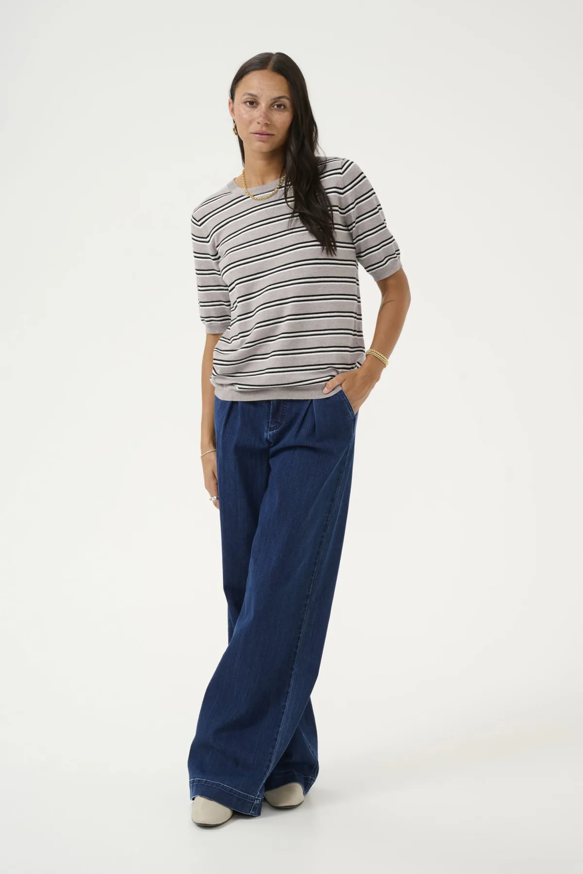 Dit gestreepte dames breisel heeft een comfortabele, rechte pasvorm, ronde hals en halflange mouwen. Ideaal voor dagelijks gebruik dankzij het zachte materiaal. Fijne was 30°, niet bleken, niet in de droger drogen, Liggend laten drogen in de schaduw, koud strijken max. 110° C, Droogreiniging 80% Viscose,20% Nylon