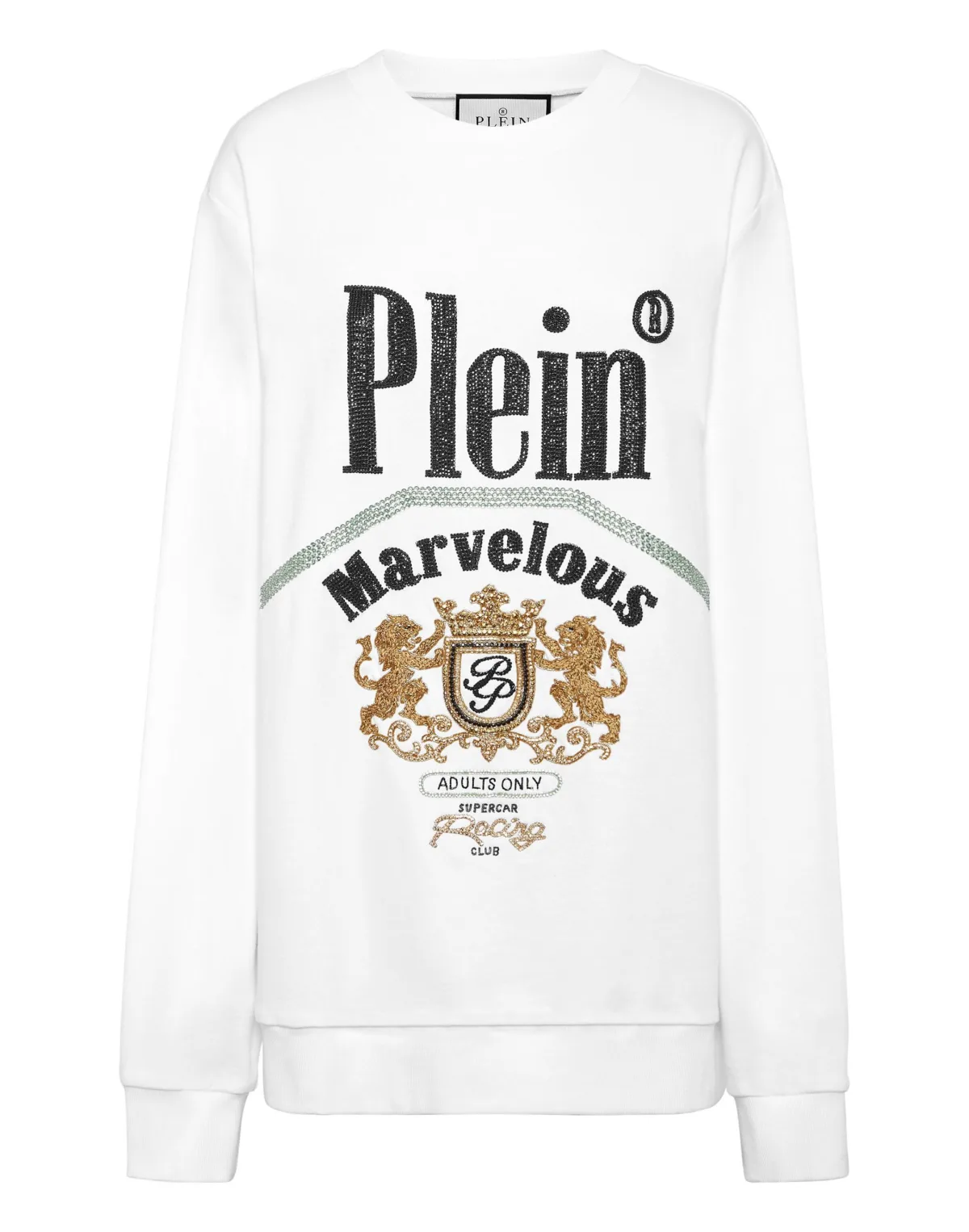 Define your style with a dash of personality. Check out this fleece sweatshirt with distinctive details. Soft cotton fleece Rhinestones application Logoed patch sewn at back Rib knit hems Fit: Oversize