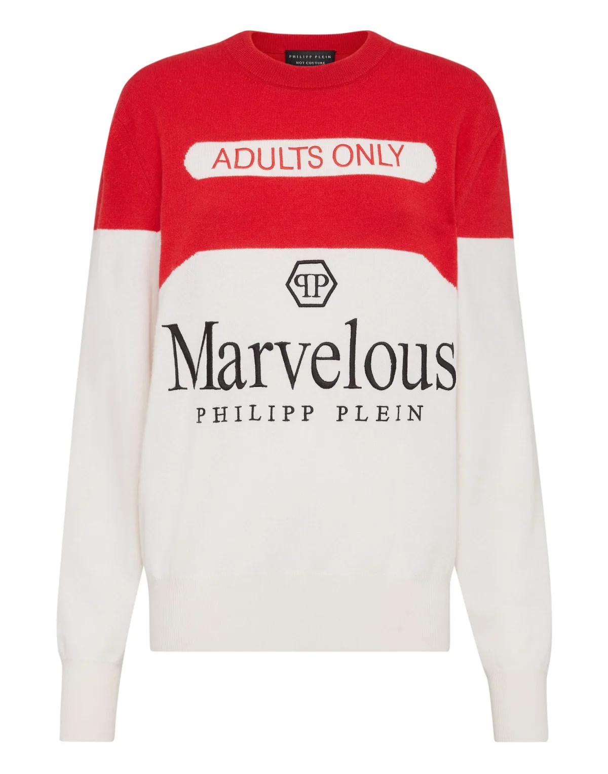 Kasjmier gebreide oversized pullover met ronde hals en ingelegde letters. Ribgebreide zomen.