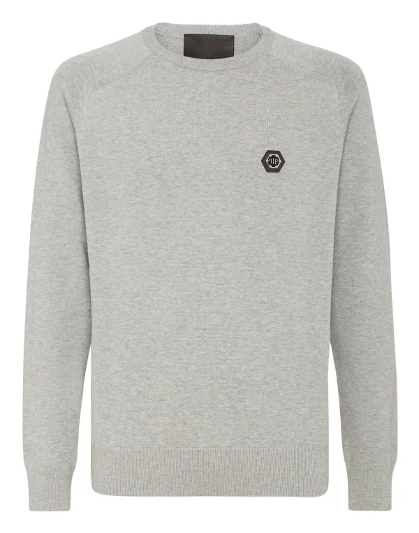 Gebreide katoenen V-hals trui met de PP Hexagon op een saffiaanleren patch op de linkerborst genaaid. Ribgebreide zomen.