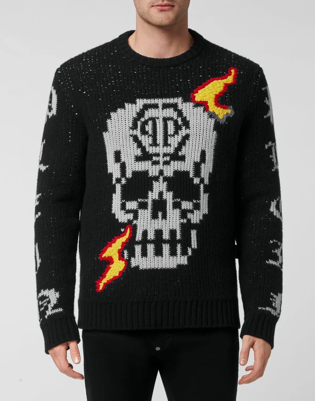 Ook een eenvoudige pullover met ronde hals kan stijl en onderscheidend vermogen uitstralen. Zoals deze ribgebreide lamswollen versie met de iconische Skull en Brand inlays. Ribgebreide zomen.