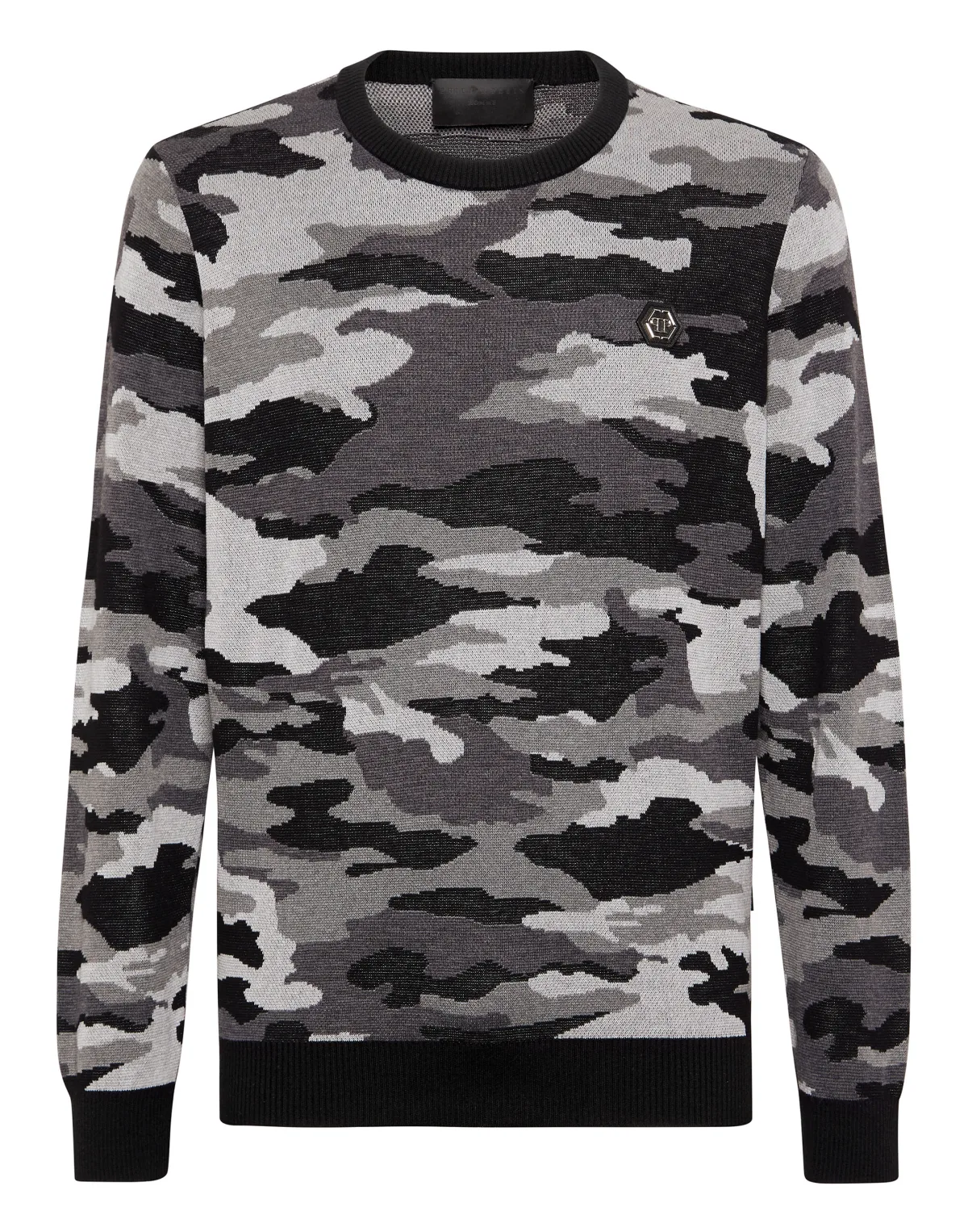 Innovation and creativity are the roots of the style of Plein. Discover the features of this original wool and silk crewneck pullover. Silk and wool featuring jacquard woven camouflage pattern Brand lettering jacquarded on the back PP Hexagon on a leather patch sewn at left chest Logoed label sewn at yoke Rib knit hems