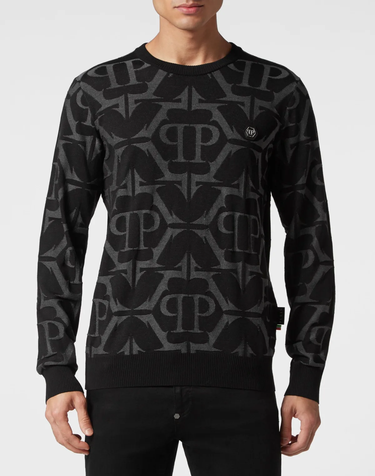 Ontdek hoe je origineel kunt zijn met alleen een pullover met ronde hals. 18-gauge gebreide zijde en wol Hexagon met logo jacquard geweven door de hele PP Hexagon op een saffiaan lederen patch genaaid op de linkerborst Label met logo genaaid op het juk Ribgebreide halslijn en zomen