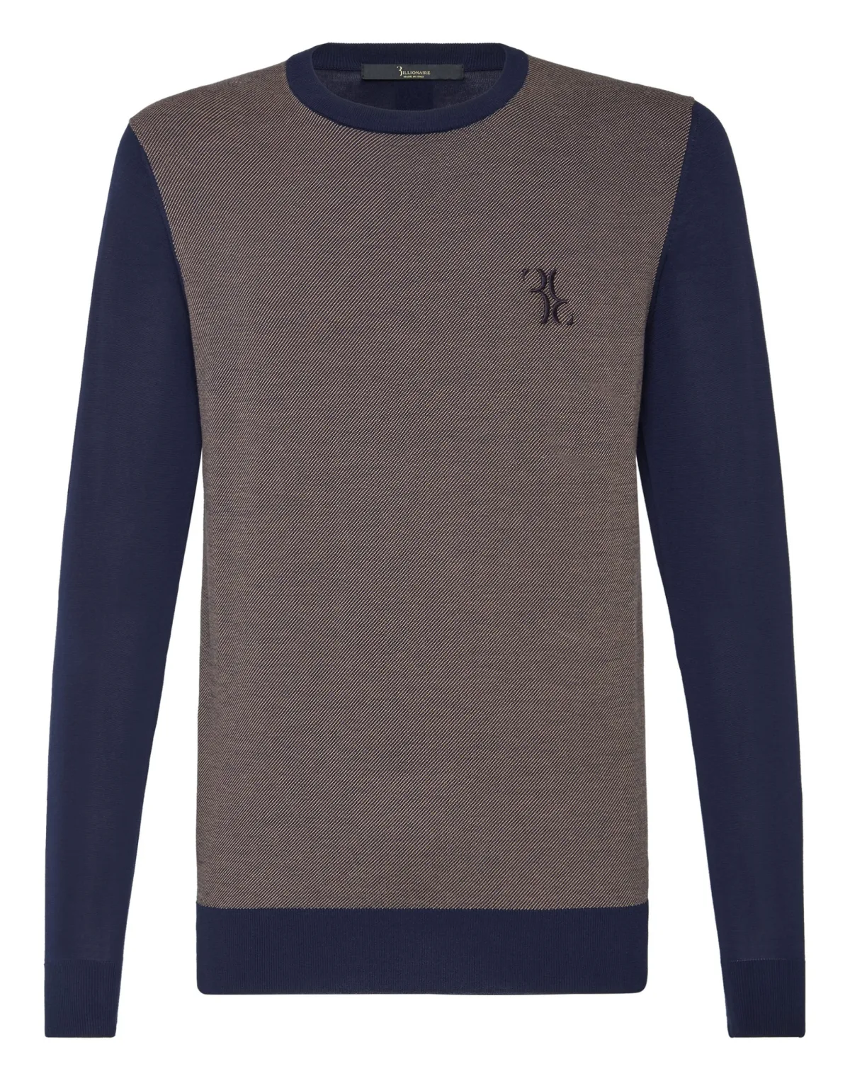 Het monogram van het merk is de versiering op deze gebreide pullover met lange mouwen van katoengaren. Het iconische symbool van het merk is geborduurd op de linkerborst en op de ophanglus bij het juk. Op de voorkant een jacquard geweven diagonaal patroon. Aflopende armsgaten. Geribde hals, manchetten en onderkant.