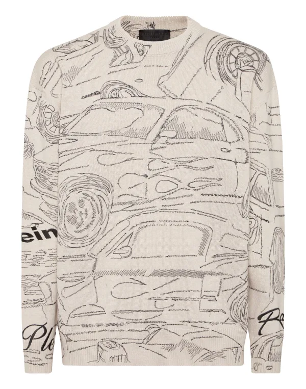 Innovation and creativity are the roots of the style of Plein. Discover the features of this original cotton crewneck pullover. 12-gauge cotton yarn All over embroidered cars Logoed patch Rib knit hems