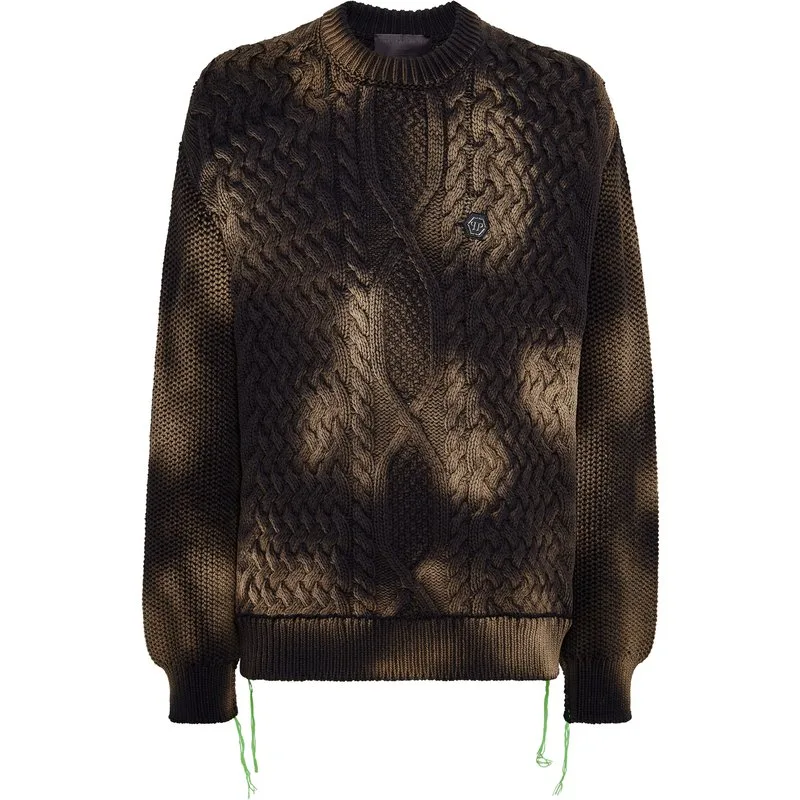 Innovation and creativity are the roots of the style of Plein. Discover the features of this soft wool knit crewneck pullover all over printed with camou pattern . 5-gauge cable and other stitch-knit lambswool The iconic Smile is embroidered on the back PP Hexagon saffian leather patch is sewn at left chest Rib knit, raw cut hems