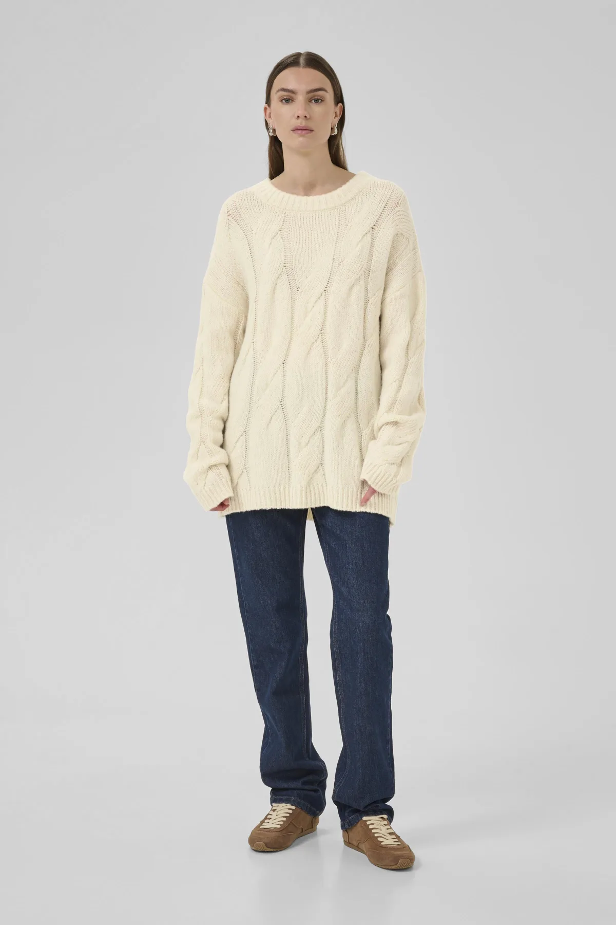 Deze dames kabeltrui heeft een comfortabele, losse pasvorm en een klassieke ronde hals. Lange mouwen en ribgebreide boorden maken hem ideaal voor dagelijks gebruik en diverse gelegenheden. Handwas, niet bleken, niet in de droger drogen, Liggend laten drogen., koud strijken max. 110° C, 67% Wol,18% Katoen,15% Polyamide