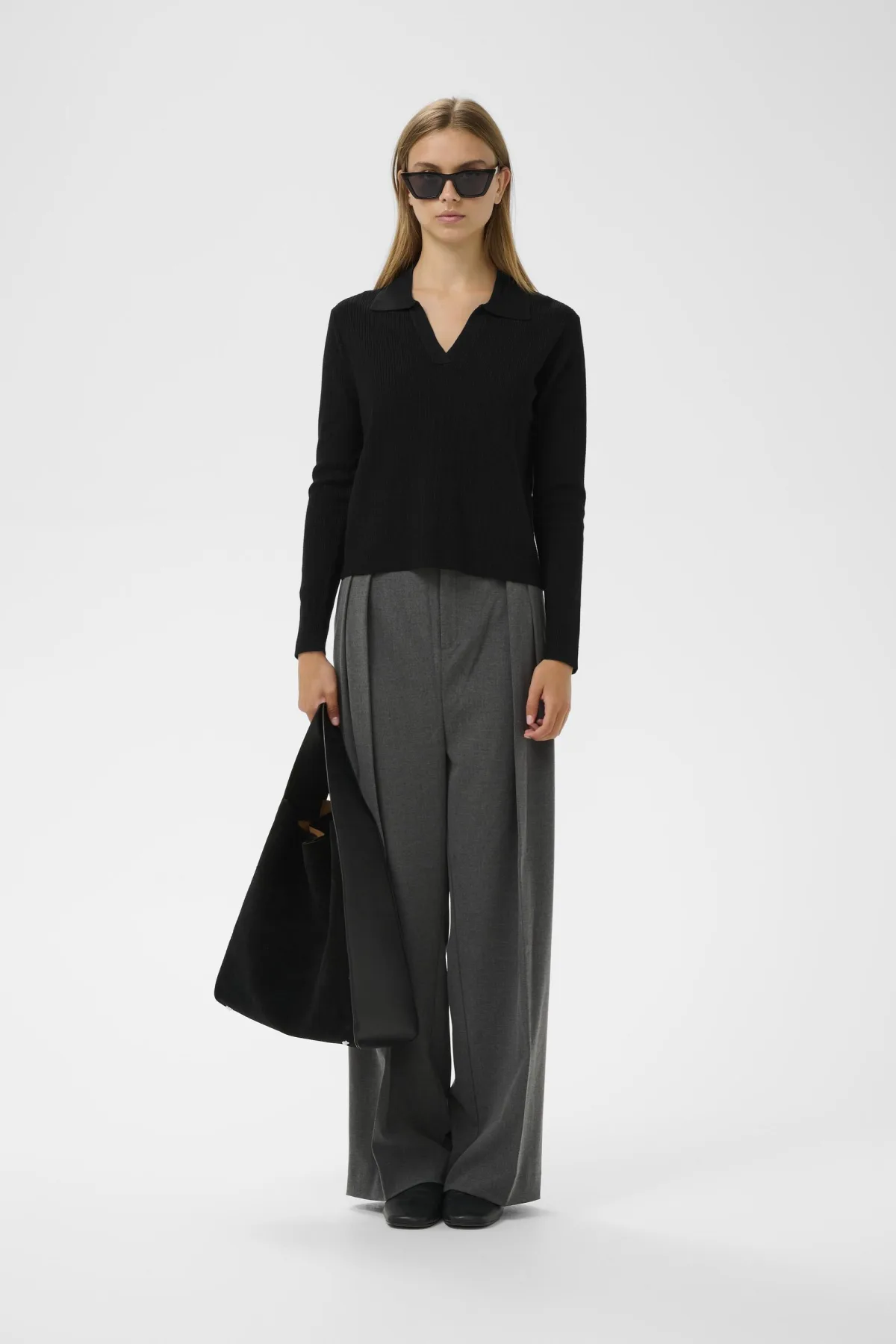 Ribgebreide trui met rechte pasvorm, diepe V-hals en opvallende kraag. Lange mouwen en een cleane zoom zorgen voor een moderne uitstraling.
