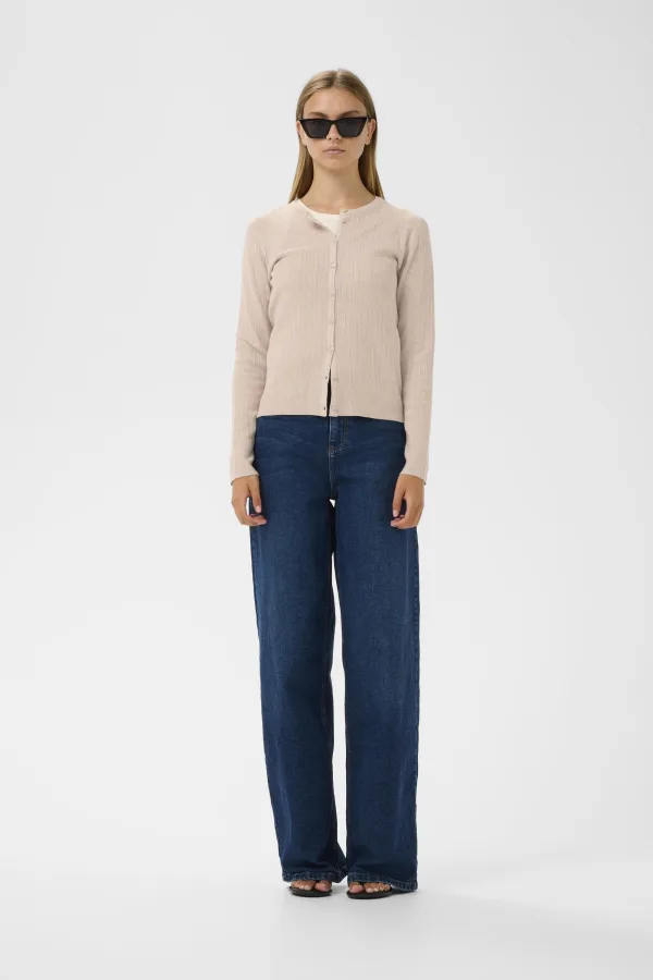 Geribde cardigan met rechte pasvorm, ronde hals en lange mouwen. Voorzien van volledige knoopsluiting en subtiel zachte uitstraling.