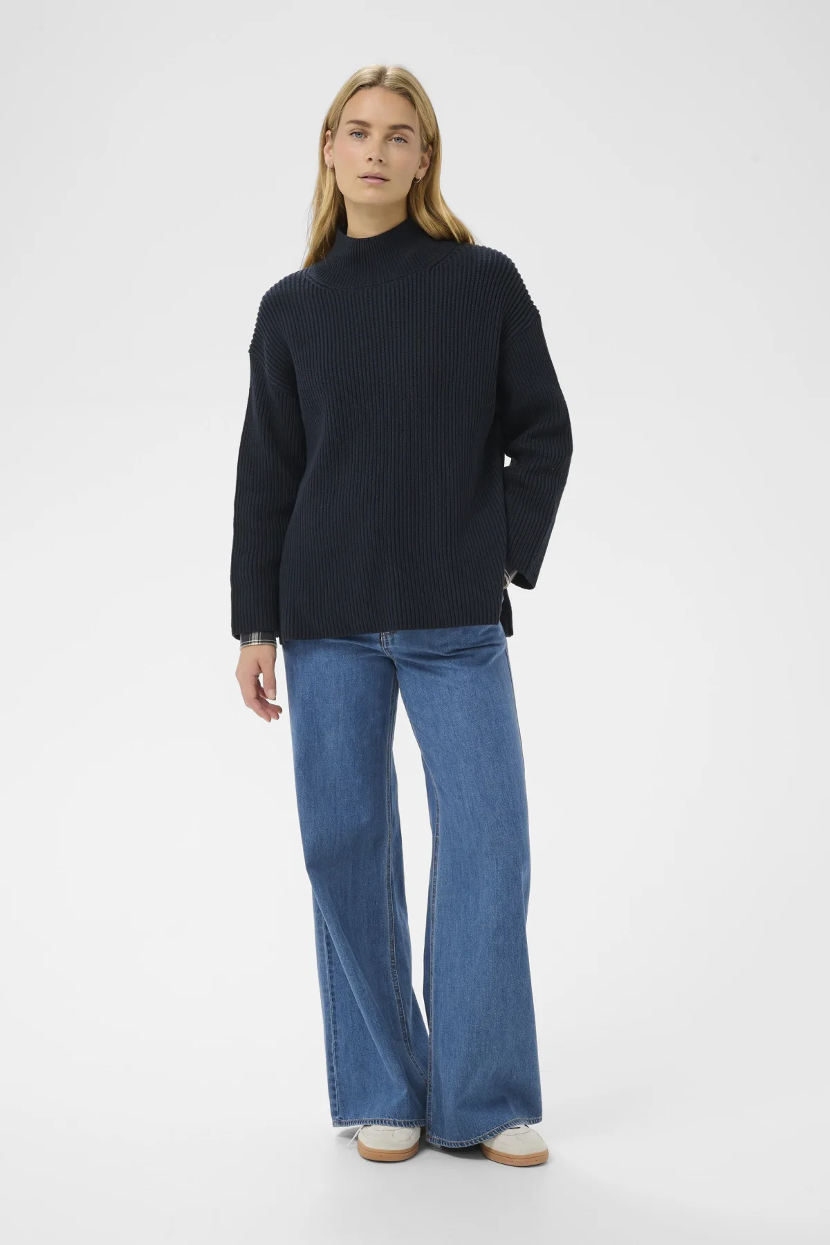 Deze dames gebreide trui met strepen heeft een losse pasvorm en hoge hals voor optimaal comfort. De lange mouwen en ribstructuur maken het ideaal voor dagelijks gebruik.