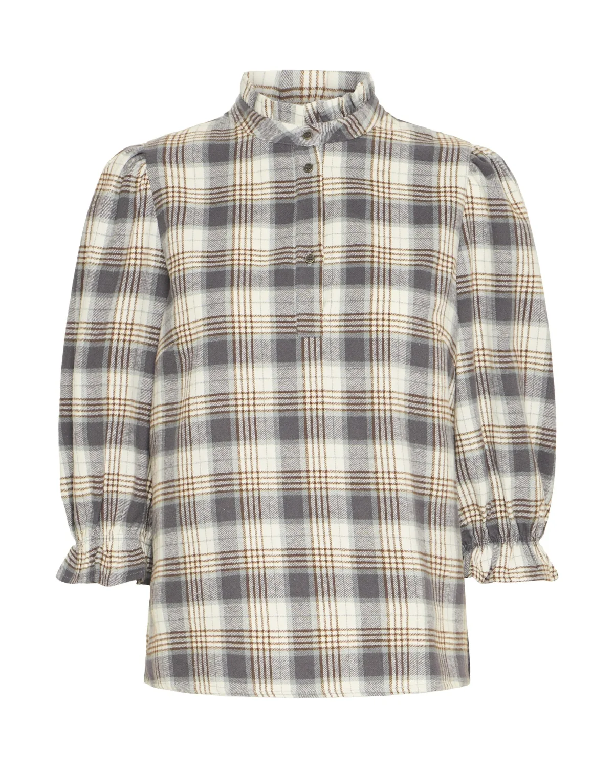 Blouse type: Wijde blouse; Design: Gevoerde zoom/rand; Type sluiting: Knoopsluiting; Materiaal: Katoen; Motief: Geruit; Kraag: Opstaande kraag; Details: Ruches, Gedrapeerd; Extra's: All-over patroon; Pasvorm: Normale pasvorm; Armlengte: Driekwart mouw; Lengte: Normale lengte