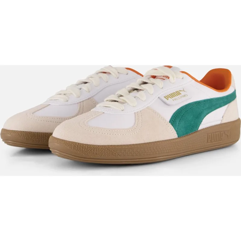 De Puma Palermo Lth sneaker is de perfecte mix van sportief en stijlvol. De beige en groene accenten geven ’m een frisse, moderne look, terwijl de oranje binnenkant zorgt voor een opvallend detail. De rubberen zool biedt fijne grip en comfort bij elke stap. Met het Puma logo op de zool, zijkant en achterkant straalt deze mannenschoen pure klasse uit.
