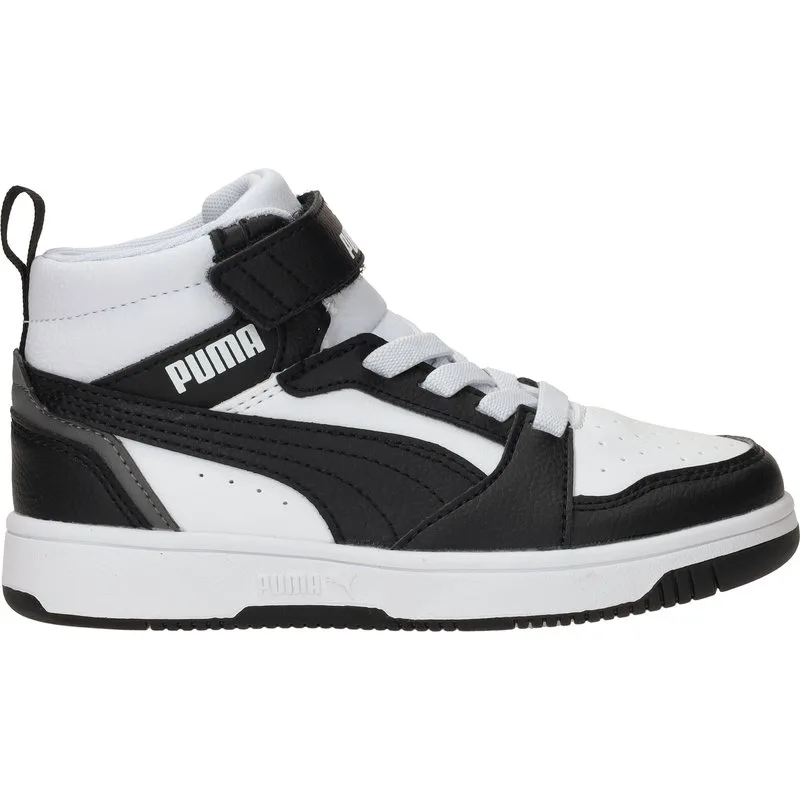 Puma Rebound V6 Mid jongens sneaker Deze sneaker is een stoere en sportieve sneaker die speciaal is ontworpen voor actieve jongens. Met zijn dynamische design en praktische kenmerken is deze sneaker een favoriet onder jonge sneakerliefhebbers. Uitgevoerd in imitatieleer met perforatie op de neus voor een goede warmteafvoer. De Forever Better-lijn waar deze sneaker bij hoort is gemaakt met gerecycled materiaal. De binnenvoering is van textiel en is voorzien van een gewatteerde enkelkraag voor meer comfort tijdens het lopen. Bevat een dempend foam-voetbed wat het loopcomfort verhoogt. Het voetbed is bovendien uitneembaar waardoor deze sneaker ook geschikt is voor steunzolen. Voorzien van een stevige rubberen loopzool met goede grip.