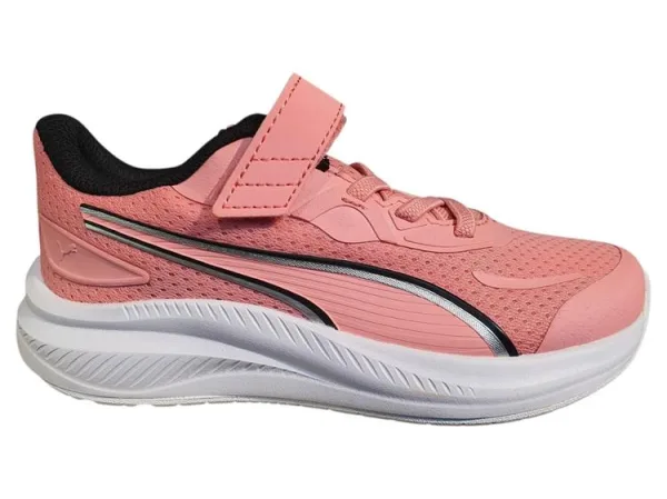 Lage sportschoen met klittenband en elastische veters, model Skyrocket 2 van het merk Puma. Gemaakt van mesh in de kleur roze. De pasvorm is normaal tot smaller. En de zool is NON-MARKING, dus geen strepen op de vloer.Let op: valt ÉÉN maat KLEINER.