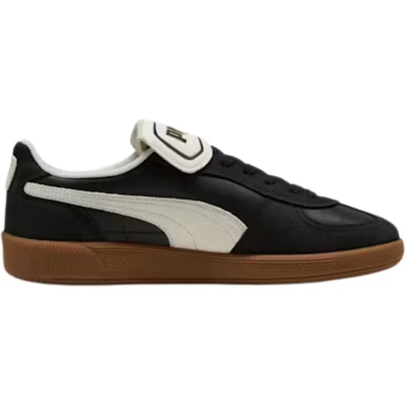 De PUMA Palermo Premium 401744-02 damessneaker laat een klassiek model opnieuw schitteren met een mix van heritage en streetstyle. Het bovenwerk is opgebouwd uit zwart synthetisch materiaal en suède, met een gebroken witte PUMA formstrip en opvallende branding op de tong, hiel en zijkant. De rubberen gumzool met merklogo in reliëf voegt een