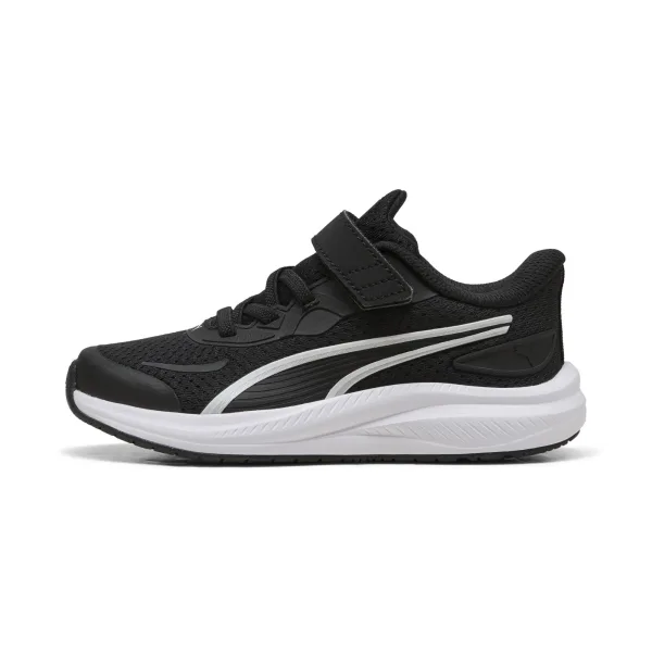 Lage sportschoen met klittenband en elastische veters, model Skyrocket 2 van het merk Puma. Gemaakt van mesh in de kleur zwart. De pasvorm is normaal tot smaller. En de zool is NON-MARKING, dus geen strepen op de vloer.