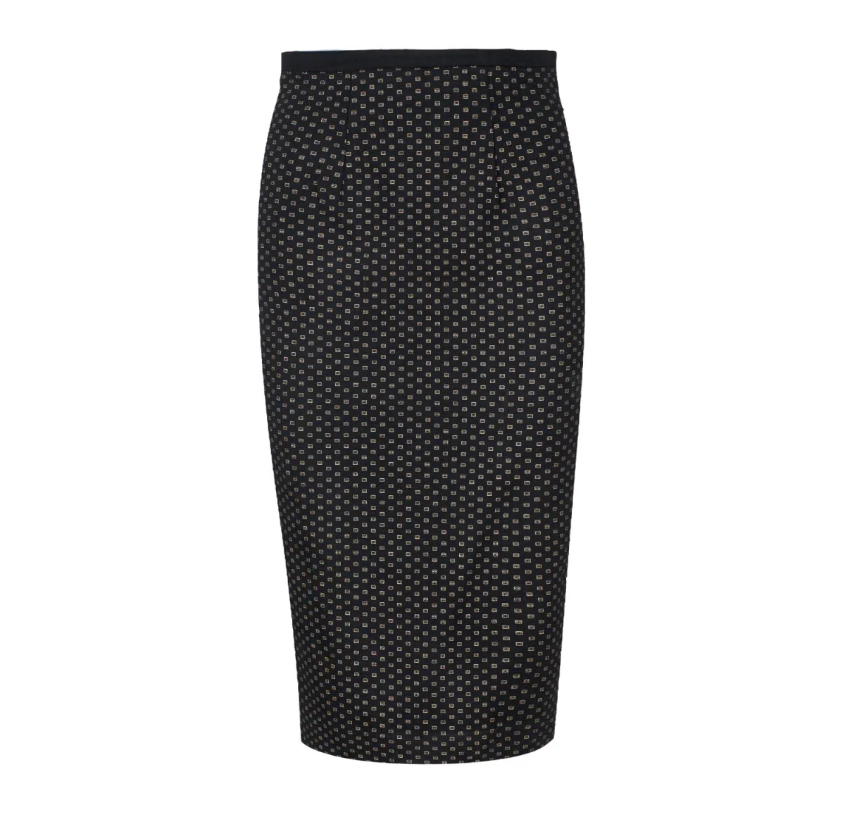 Deze bedrukte kokerrok met hoge taille is gemaakt van bedrukte Punto di Roma-stof. Met een blinde ritssluiting en een kleine split aan de achterkant. De kokerrok heeft een stretch polyester voering. De rok heeft een midi lengte en een aansluitend silhouet.