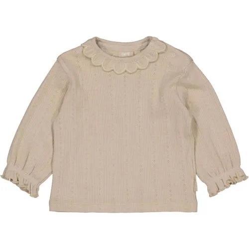 Voor een zachte start van de dag is deze meisjes longsleeve van QPI Newborn een praktische basic in de kledingkast van je baby. De lichtbruine kleur is rustig en makkelijk te combineren, terwijl de subtiele ajourstructuur en ruches langs de schouders zorgen voor een sierlijk detail. Gemaakt van 100% katoen voelt het shirt zacht aan op de gevoelige babyhuid.Comfortabel ontwerp voor de allerkleinsten Gemaakt van 100% katoen, wat prettig aanvoelt op de huid van je baby Lange mouwen, ideaal voor extra warmte en bescherming Ronde hals met drukknoopsluiting, zodat je de longsleeve makkelijk aan- en uittrekt Lichtbruine effen kleur, goed te combineren met verschillende broekjes en leggings Ajourdetails en ruches op de schouders voor een speels accent Geschikt voor baby en newborn maten Onderhoudsvriendelijk: wasbaar op 30 graden en warm strijkbaarPraktisch in het dagelijks gebruikDit shirt is geschikt voor dagelijks dragen, van een rustige dag thuis tot een bezoekje aan familie. De rechte mouwen geven genoeg bewegingsvrijheid om te spelen en te ontdekken. Door de drukknoop bij de hals is omkleden snel en rustig gedaan, ook als je baby even niet zo meewerkt.QPI Newborn voor een zachte startQPI Newborn richt zich op comfortabele babykleding die prettig aanvoelt en makkelijk in gebruik is. De ontwerpen zijn afgestemd op de allereerste maanden, met praktische details zoals sluitingen die snel openen en sluiten en soepele stoffen. Zo kun jij je focussen op de momenten samen, terwijl je baby comfortabel gekleed is.Een zachte, praktische basis voor elke baby-outfit.