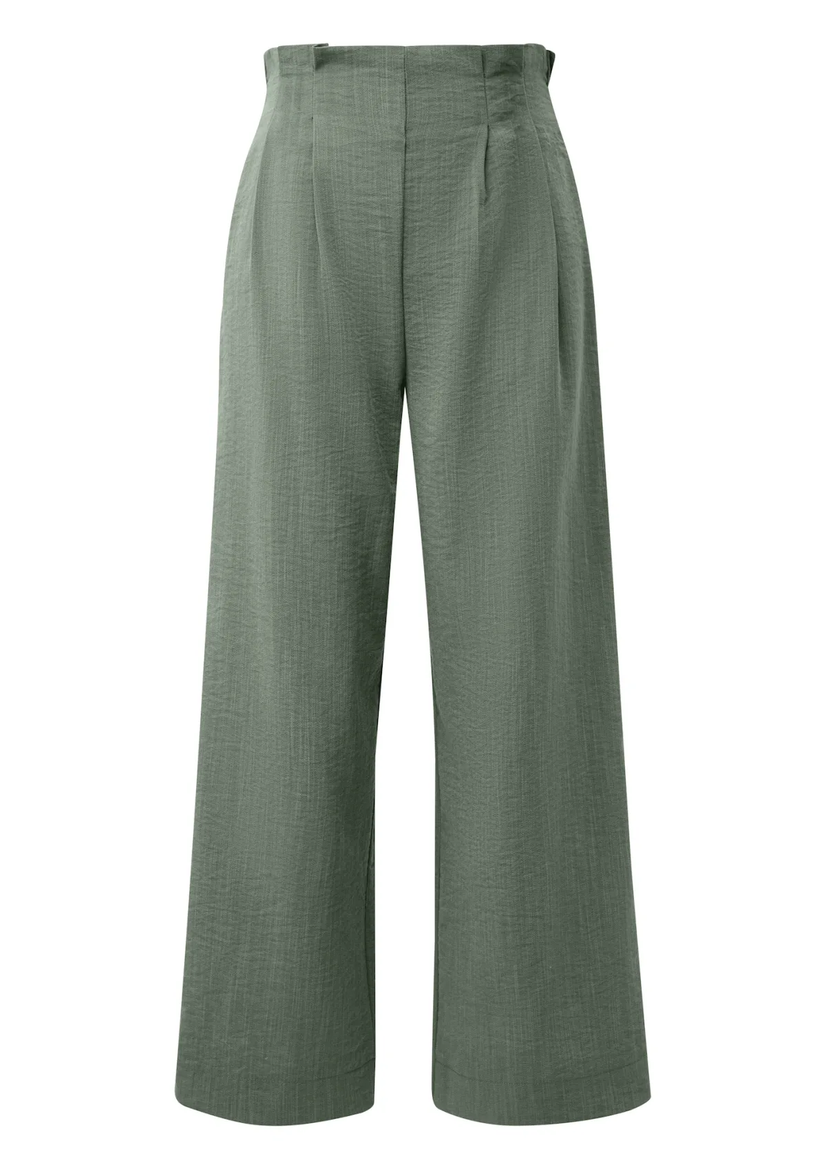 Voor een ontspannen maar verzorgde look is deze kaki wide leg broek voor dames een praktische basis in je garderobe. De broek heeft een high rise taille met elastische band in paperbag-stijl, waardoor de taille duidelijk wordt geaccentueerd en de broek comfortabel aansluit. De soepel vallende, geweven stof en de wide leg pijpen zorgen voor een vloeiende lijn langs het been die de hele dag prettig aanvoelt.Details die het verschil maken High rise taille met elastische band en bandplooien voor een comfortabele, aangesloten pasvorm Wide leg pijpen en lange lengte zorgen voor een vloeiende, moderne look Gemaakt van een zachte stof met viscose en polyamide voor een soepele, gladde touch Haak- en oogsluiting met ritssluiting aan de voorkant voor een nette afwerking Steekzakken aan de zijkanten, handig voor kleine essentials Effen kaki kleur, makkelijk te combineren met tops, T-shirts en blouses Geschikt voor dagelijkse, casual gelegenheden in het voorjaar en daarbuitenCasual styling voor elke dagDeze broek uit de Daily collectie laat zich eenvoudig stylen. Combineer met een eenvoudig T-shirt en sneakers voor een relaxte dag, of kies een lichte blouse en loafers voor een meer geklede, maar nog steeds comfortabele outfit. De wide leg pasvorm valt ruim om het been zonder strak te zitten.QS: moderne stijl voor alledagQS staat voor eigentijdse, casual kleding die goed aansluit op het dagelijks leven. De collecties volgen de nieuwste trends, maar blijven tegelijkertijd draagbaar en toegankelijk. Met deze broek voeg je een kledingstuk toe waar je gemakkelijk naar grijpt op verschillende dagen van de week.Een rustige basis als je comfort, een ontspannen pasvorm en een moderne lente-outfit belangrijk vindt.