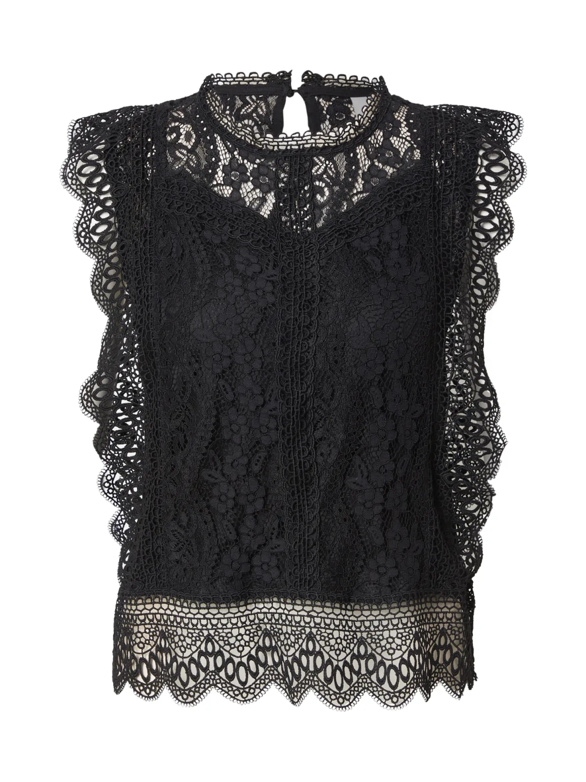 Blouse type: Blouseshirt; Design: Keyholesluiting, Geschulpte zoom; Type sluiting: Knoopsluiting; Motief: Effen; Kraag: Zonder kraag; Details: Cut-outs, Ruches, Kant; Extra's: Licht transparant, Lichte stof; Pasvorm: Normale pasvorm; Armlengte: Mouwloos; Lengte: Normale lengte