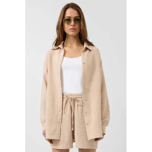 Deze beige oversized dames blouse van katoen is een luchtige basic voor zomerse dagen. De blouse heeft een relaxte, casual uitstraling en valt ruim om het lichaam, wat zorgt voor veel bewegingsvrijheid. De double face stof met subtiele wafelstructuur geeft extra diepte aan de effen kleur en voelt zacht aan op de huid. Ideaal als licht laagje over een top of gewoon zo, op je favoriete broek of short.Verfijnde details voor elke dag Gemaakt van 100% katoen, voor een ademend en comfortabel draaggevoel Oversized pasvorm met rechte mouwen en verlaagde schoudernaden voor een ontspannen look Lange mouwen met manchetten die je ook makkelijk oprolt Ronde hals in combinatie met een klassieke overhemdkraag Knoopsluiting over de hele lengte aan de voorkant Afgeronde zoom die mooi valt, zowel los gedragen als in de broek Effen beige kleur, eenvoudig te combineren met andere items Luchtige double face stof met wafeltextuur voor een moderne uitstralingCasual blouse voor zomerse outfitsDeze blouse komt uit een daily collectie en is bedoeld voor alledaagse, casual momenten. Draag de blouse open over een top voor een laagjeslook, of dichtgeknoopt op een jeans of wijde broek. De luchtige katoenen stof maakt het geschikt voor het zomerseizoen.QS: eigentijdse basicsQS focust op moderne, toegankelijke mode met duidelijke vormen en draagbare stijlen. De collecties sluiten aan op een dagelijkse garderobe waarin comfort en stijl samenkomen. Met deze blouse voeg je een praktisch kledingstuk toe dat je het hele seizoen door kunt blijven dragen.Een lichte, comfortabele blouse die je makkelijk pakt voor elke casual dag.