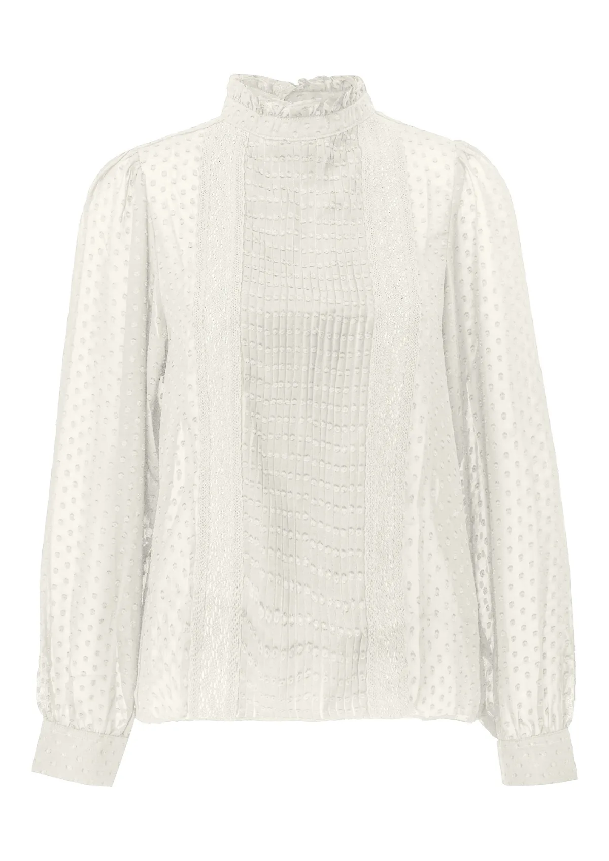 Blouse type: Blouseshirt; Design: 1-knoops manchetten, Keyholesluiting, Pofmouwen; Type sluiting: Knoopsluiting; Motief: Effen; Kraag: Opstaande kraag; Details: Ruches, Kant, Gedrapeerd, Plissé; Extra’s: Fully fashioned, Op staal naden, Lichte stof; Pasvorm: Normale pasvorm; Armlengte: Lange mouw; Lengte: Normale lengte