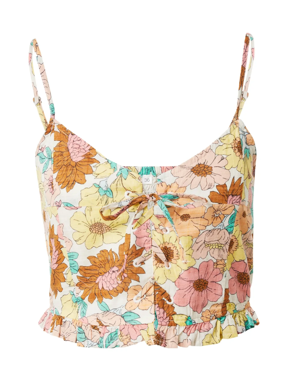 Blouse type: Blouseshirt; Design: Gevoerde zoom/rand, Asymmetrische zoom, Om te knopen/binden; Materiaal: Katoen; Motief: Bloemenprint; Kraag: Zonder kraag; Details: Ruches, Gedrapeerd; Extra’s: All-over patroon, Voelt zacht aan; Pasvorm: Normale pasvorm; Armlengte: Mouwloos; Lengte: Korte pasvorm